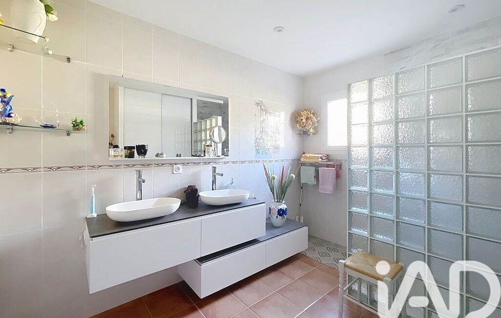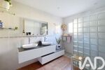 La salle d'eau de 9m2 se compose d'une douche à l'italienne, une double vasque moderne et un wc.