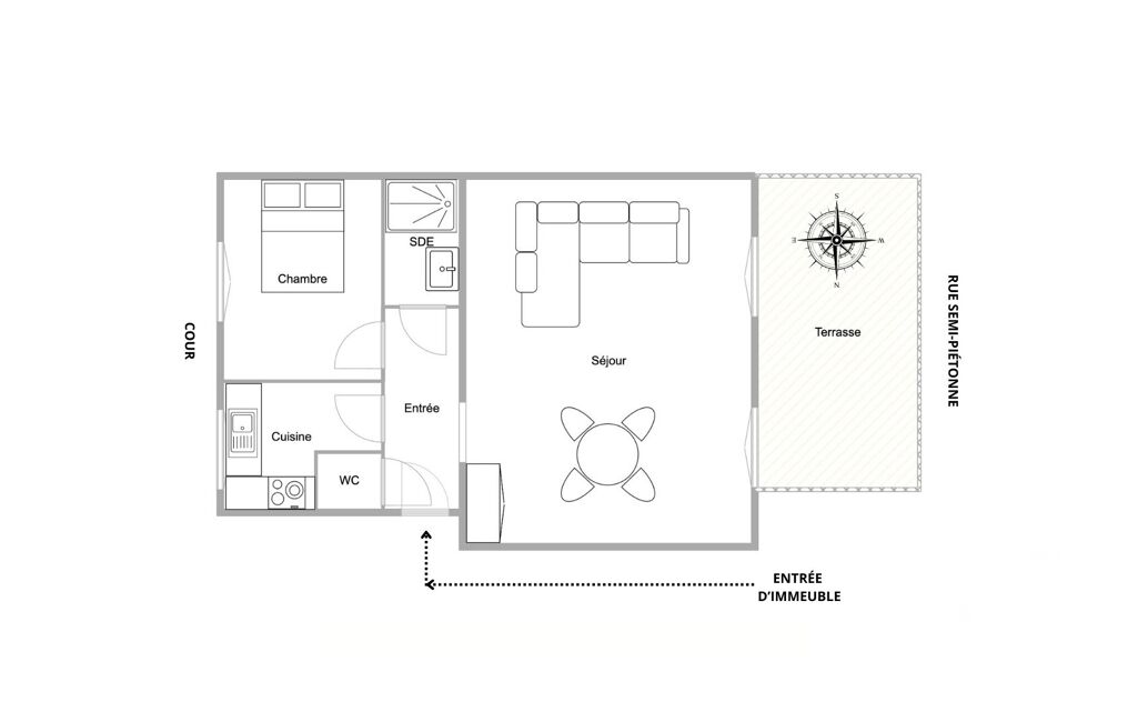 Il se compose d’un beau séjour de 23 m² exposé ouest, donnant sur une terrasse privative de 11 m², d’une petite chambre, d’une cuisine équipée, d’une salle d’eau, ainsi que des toilettes séparées.