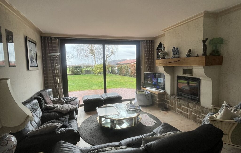 - Salon avec baie vitrée, vue sur le jardin, cheminée à insert