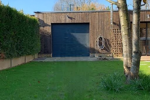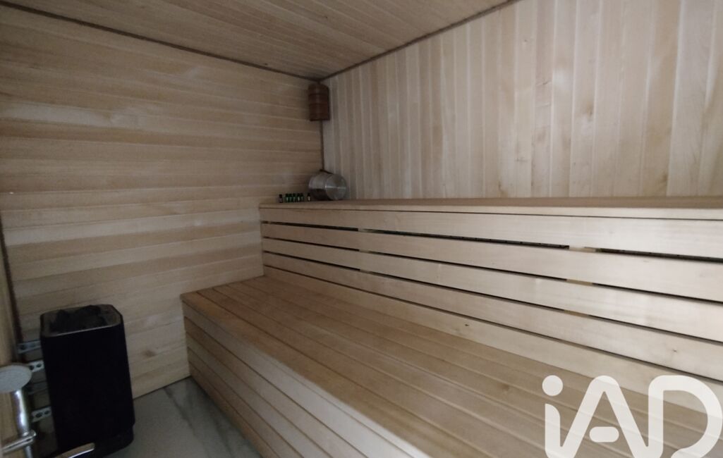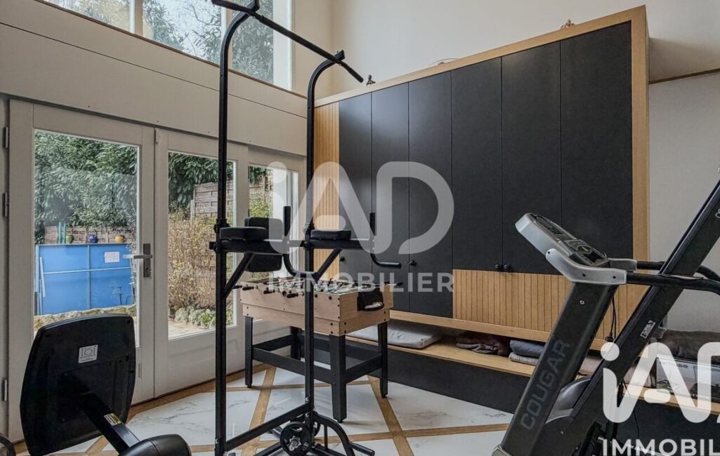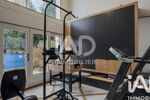 En contre bas avec une baie vitrée cathédrale : une salle de sport de 17m² donnant sur une terrasse extérieure de 95m² et sur une cuisine d'été/buanderie/salle de douche/WC - puis d'un double garage traversant et un grand atelier -
