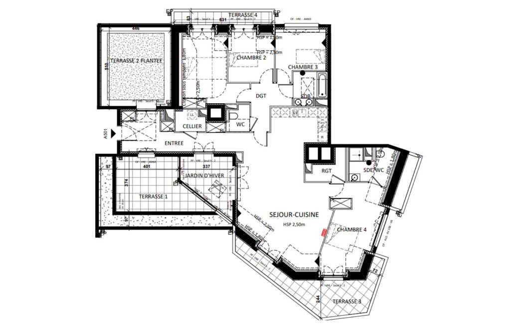 Situé au 5 ème étage, cet appartement T5 de 137 m² environ habitables bénéficie de 81 m² environ d’espaces extérieurs répartis entre trois terrasses, un jardin d’hiver et une terrasse plantée.