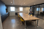 Le premier niveau se compose de trois bureaux vitrés fermés, d’une grande salle de réunion, espace cuisine et de