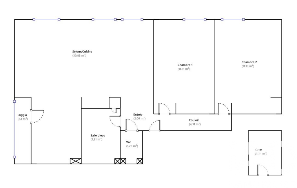 T3 au premier étage sans ascenseur entièrement rénové. Il se compose: d'un grand séjour exposé au Sud-Est avec cuisine équipée ouverte (>30m2) et loggia, une salle d'eau, un WC séparé et deux chambres avec placards (>11 m2).