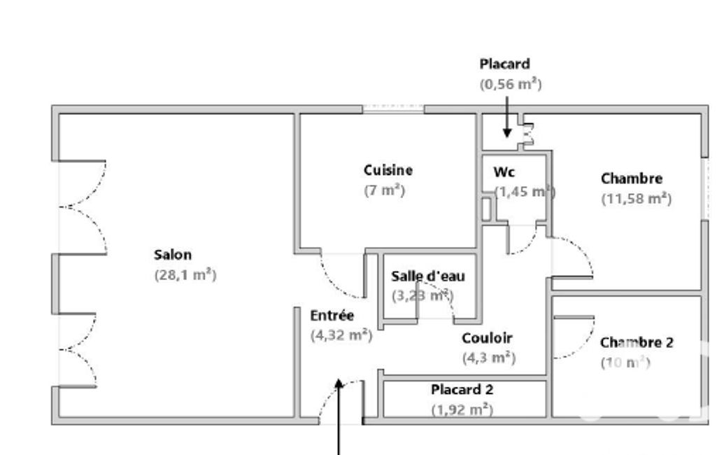 Cet appartement offre un confort optimal avec un séjour lumineux de 28 m², une cuisine aménagée, un couloir avec placards desservant une salle d'eau, deux chambres (10 et 11,60 m²) et des toilettes séparées.