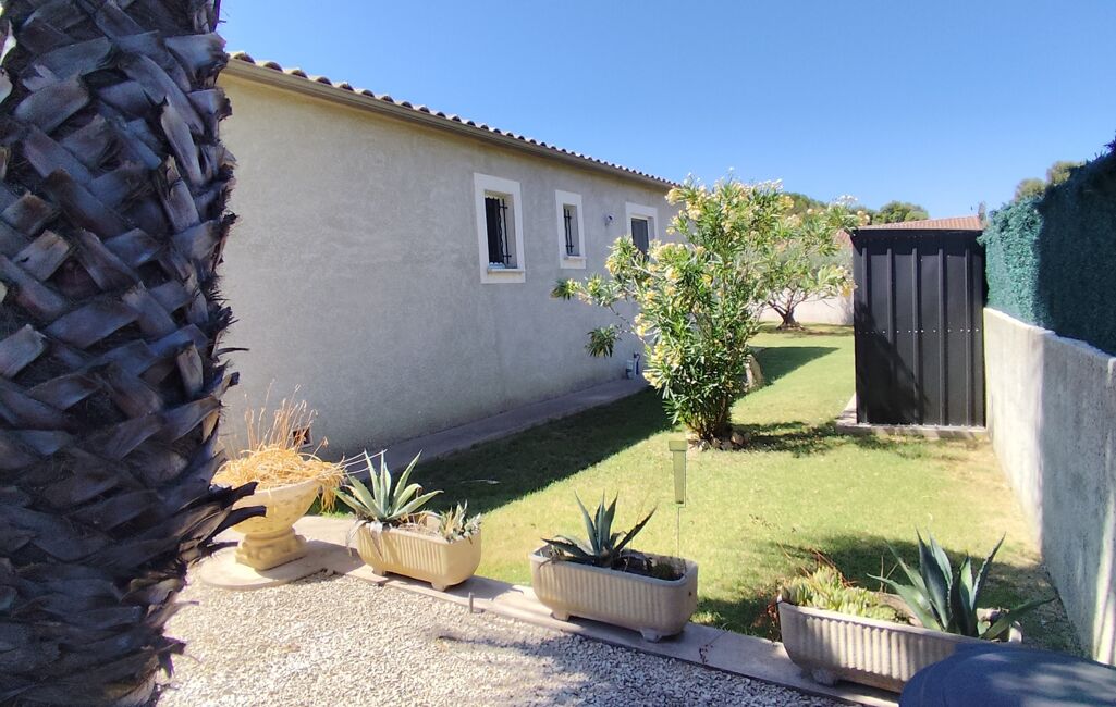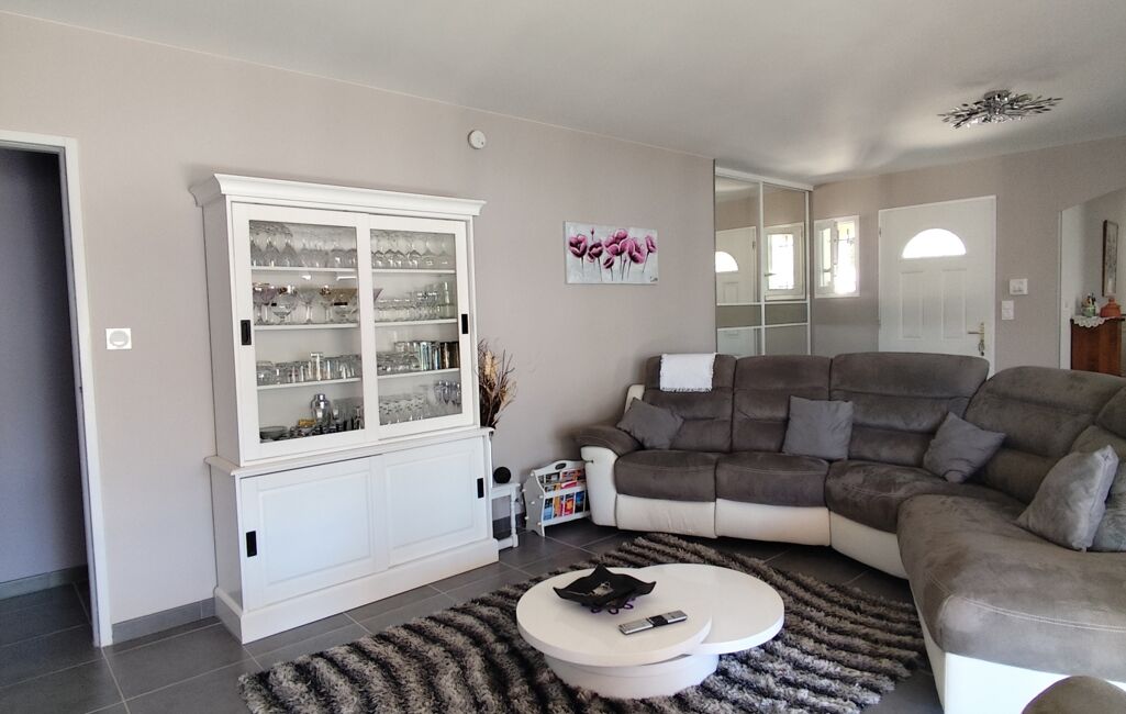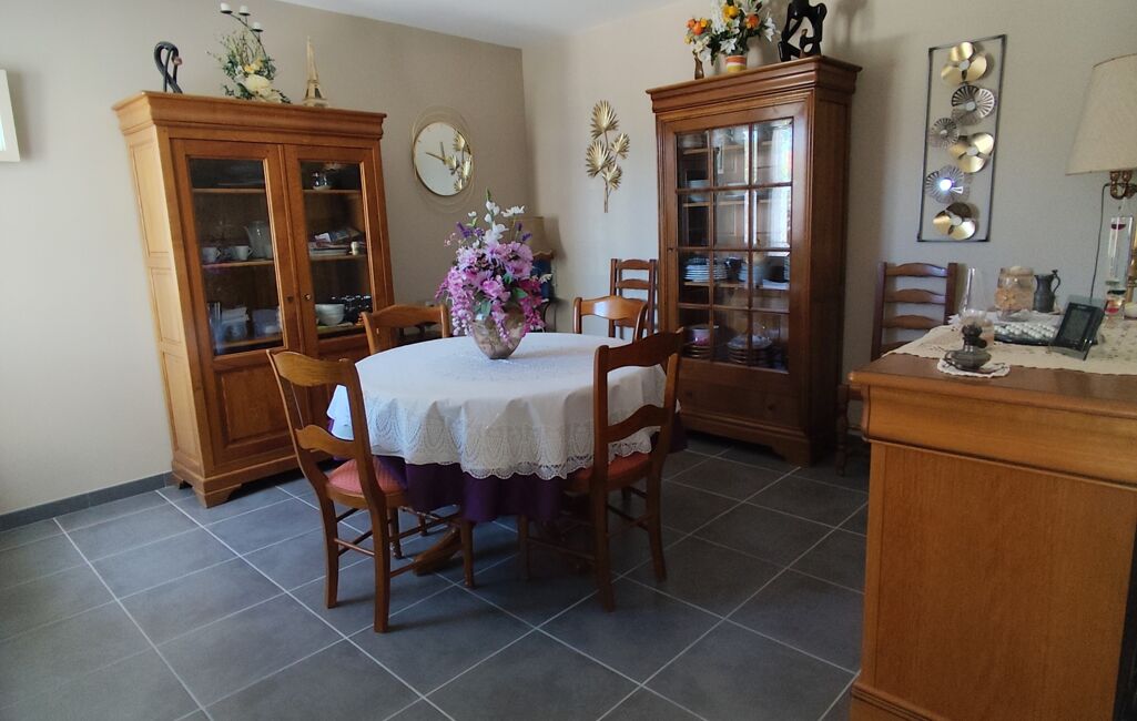 Au cOEur d'un jardin arboré de 800m2, cette propriété de plain-pied vous offre un espace de vie harmonieux et lumineux. L'agencement intérieur comprend 4 chambres spacieuses, une salle de bain, un WC indépendant, une cuisine ouverte entièrement équipée donnant sur un spacieux séjour, ainsi qu'une salle à manger conviviale.