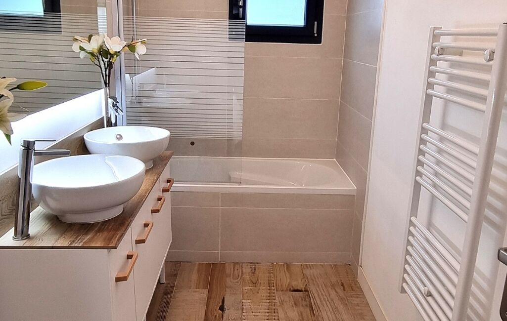 Dès l’entrée, on découvre une pièce de vie lumineuse, ouverte sur une cuisine aménagée fonctionnelle, prête à accueillir les repas en famille ou entre amis. L’espace nuit offre trois chambres dont une suite parentale, conçue pour préserver l’intimité et le confort de chacun.