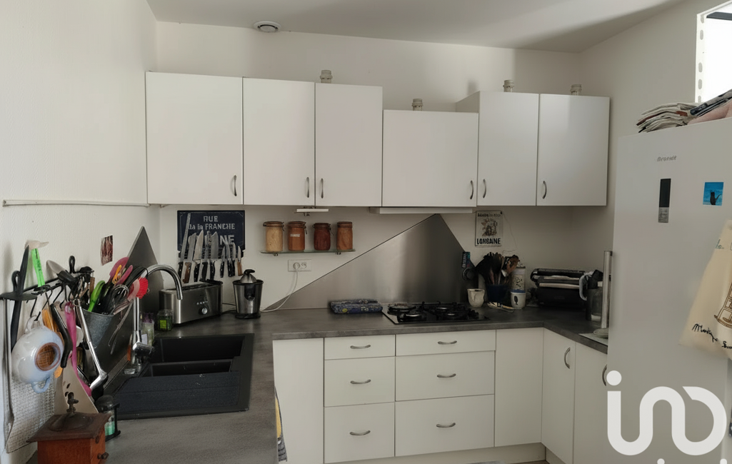 Cuisine américaine semi-équipée et aménagée, ouverte sur une pièce de vie lumineuse.