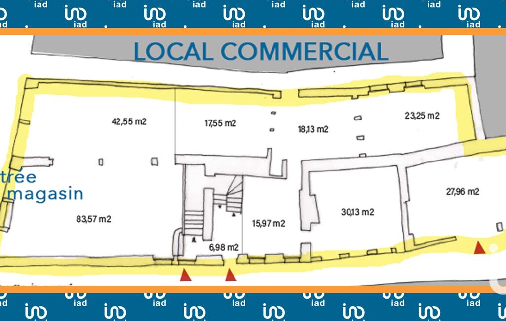 - Rez-de-chaussée : grand magasin avec escalier menant à l’étage, réserve et entrepôt