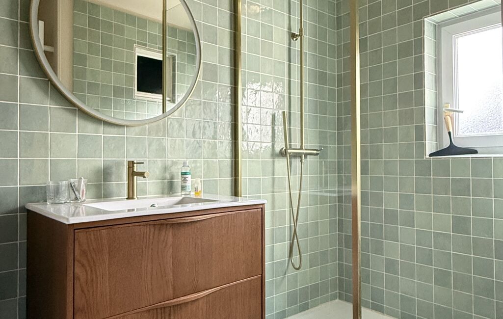 Elle propose au RDC : entrée, WC, salle d’eau, bureau, salon chaleureux et cuisine dinatoire aménagée. Rénovation dans un esprit authentique mêlant pierres apparentes, tommettes et travertin.