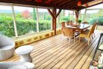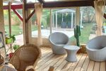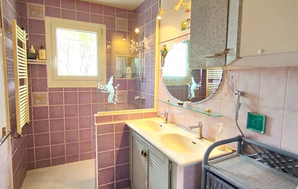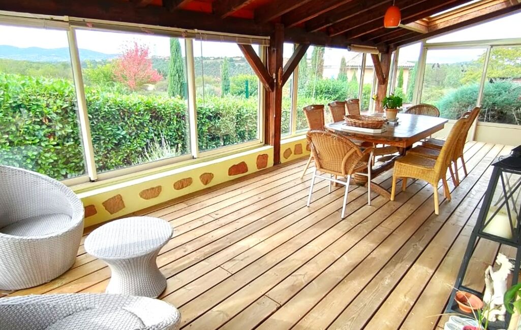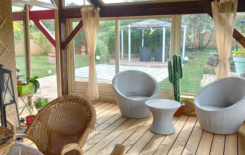 Dès l’entrée, une belle pièce de vie lumineuse, équipée d’une cheminée et d’une climatisation réversible, parfaite pour votre confort toute l’année. La véranda de 26 m², entièrement vitrée, prolonge l’espace et offre une vue apaisante sur le jardin.