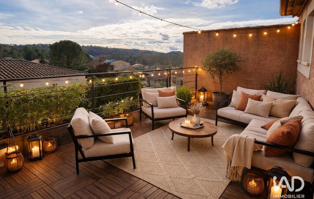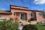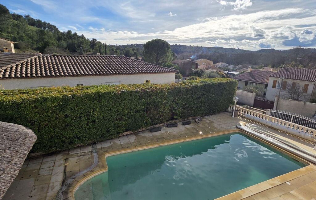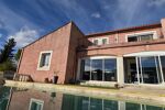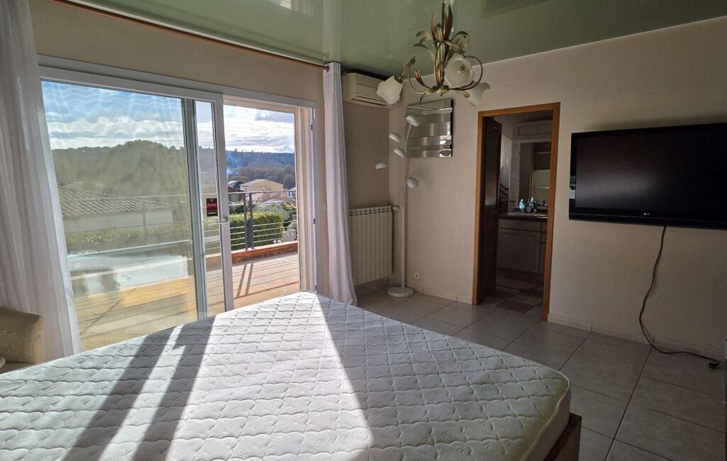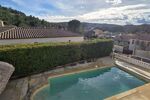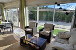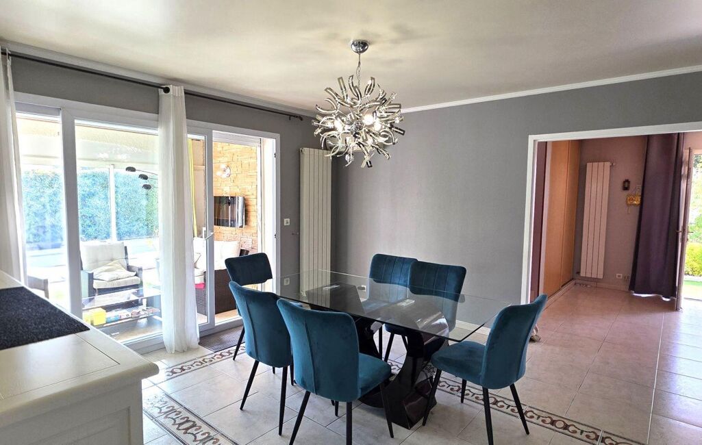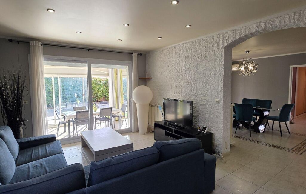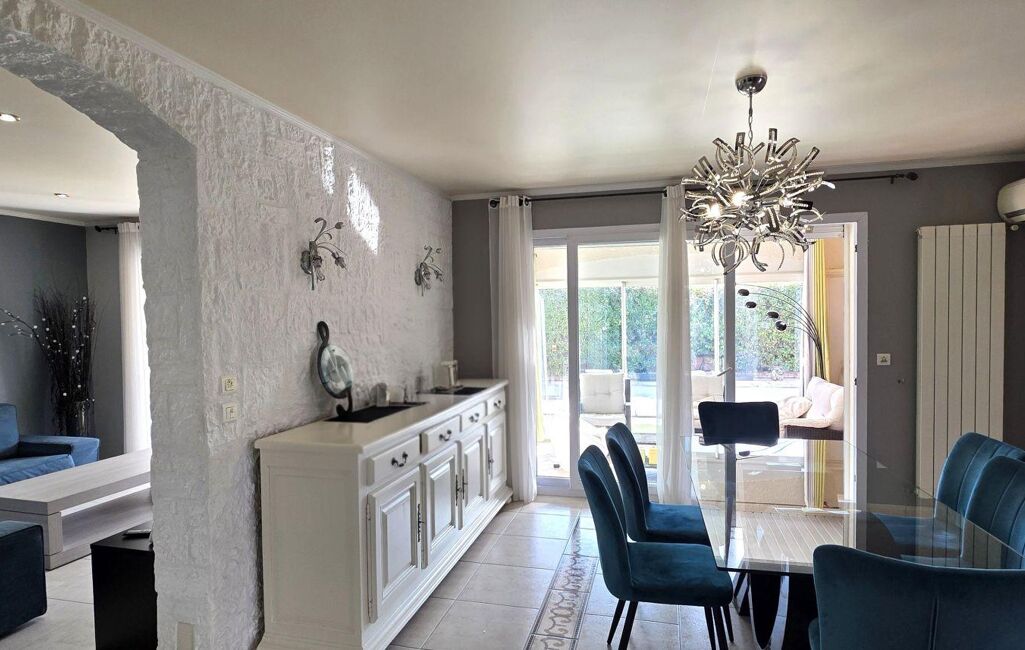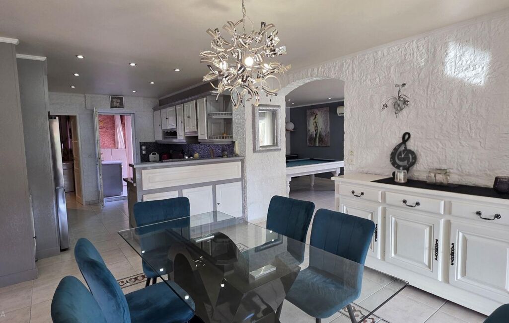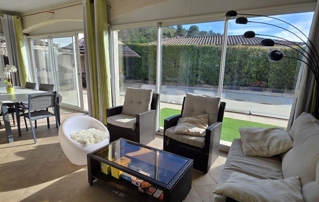 Le tout se prolonge grâce à de grandes baies vitrées sur une terrasse fermée de plus de 30m2 environ et deux autres terrasses donnant sur l'espace piscine .