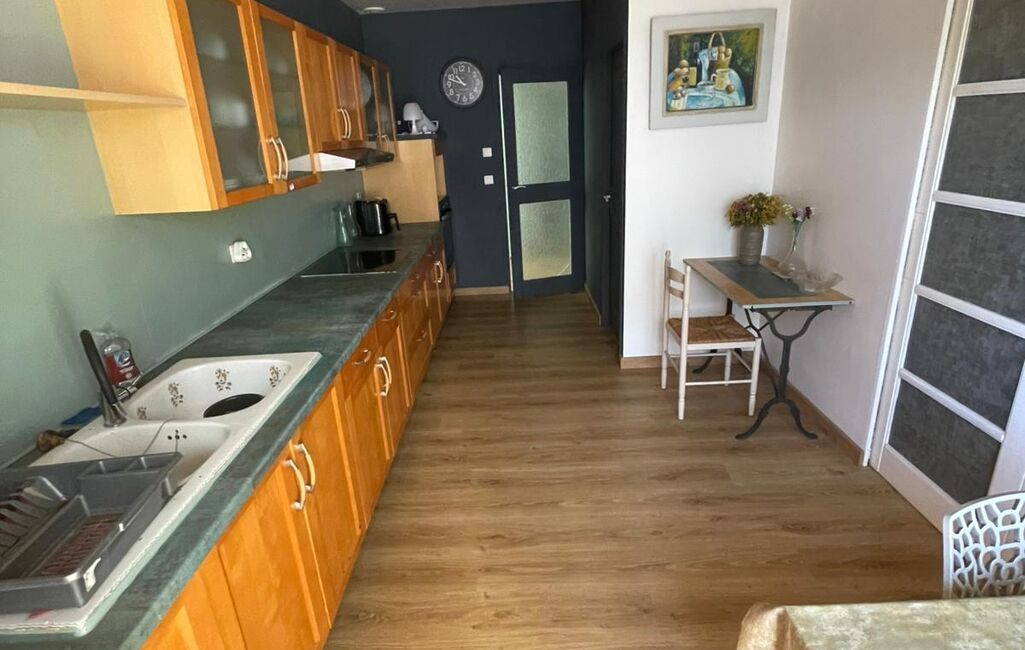 La cuisine, aménagée et équipée , donne sur le salon/salle à manger. Les grandes baies vitrées ouvrent sur le vaste terrain de 409m² offrant de nombreuses possibilités d'aménagement paysager pour les amoureux de jardinage ou pour créer un espace de détente extérieur.