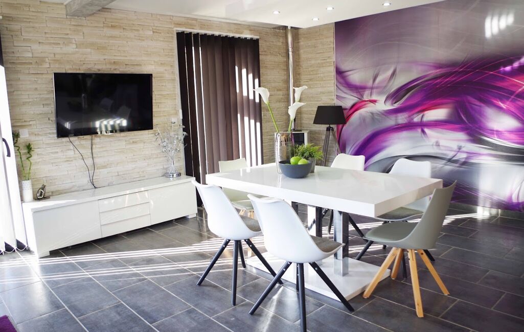 Salon séjour lumineux, avec sa cuisine américaine.