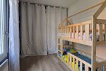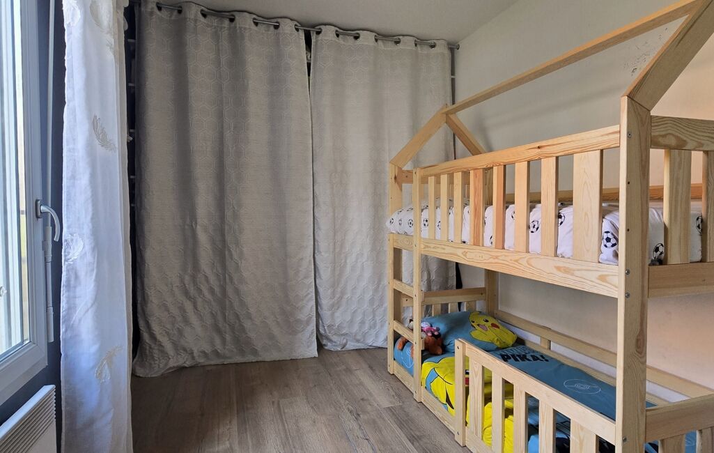 L’espace nuit comprend deux chambres, une salle de bains avec branchement pour machine à laver et un WC séparé.