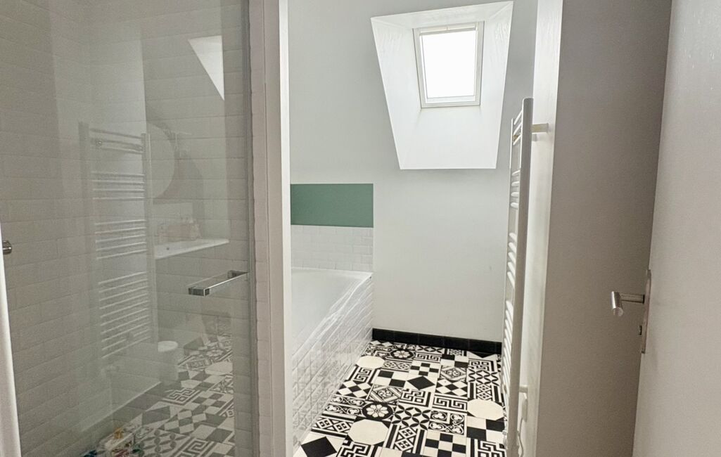 •Une salle de bain avec douche et baignoire