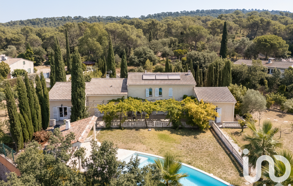 iad France - Carine DESMOULIN vous propose: Découvrez cette élégante bastide de plain-pied de plus de 260 m² et laissez-vous séduire par ses volumes généreux. Edifiée sur un terrain de 5500 m² alimenté par le canal de Provence, elle conjugue art de vivre, fonctionnalité et nature.