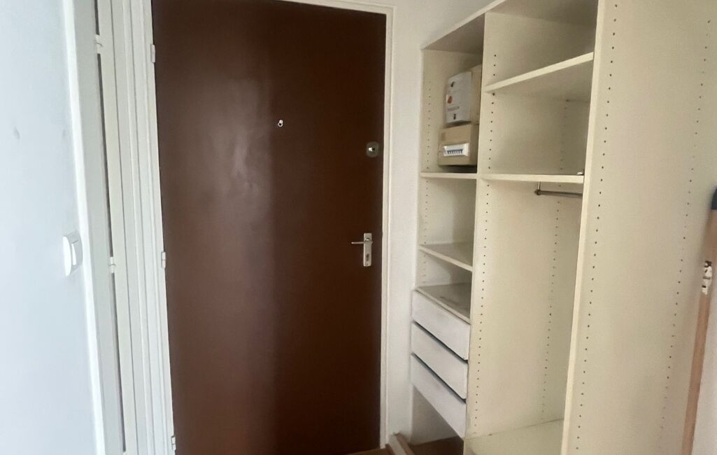 une entrée avec placard, une pièce de vie avec coin cuisine ouvrant sur un balcon-terrasse, une salle d’eau et des WC séparés.