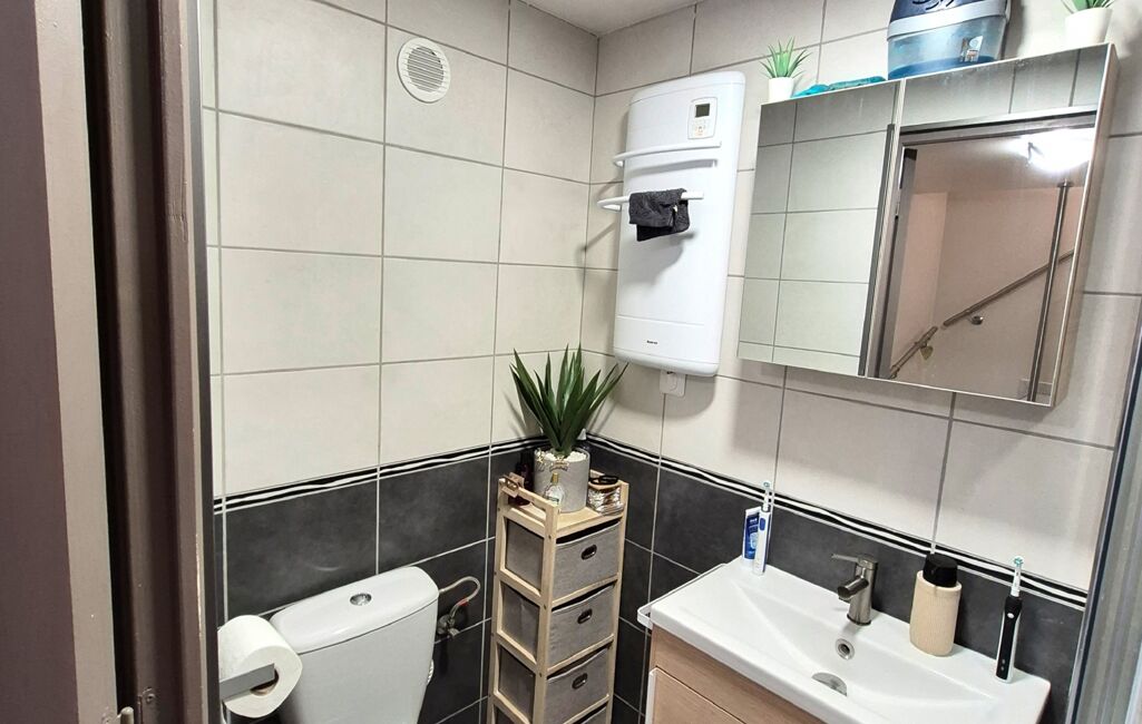 Niveau inférieur : Une buanderie pratique, une cuisine fonctionnelle avec accès à une belle terrasse, et une salle de bain avec douche et toilette.