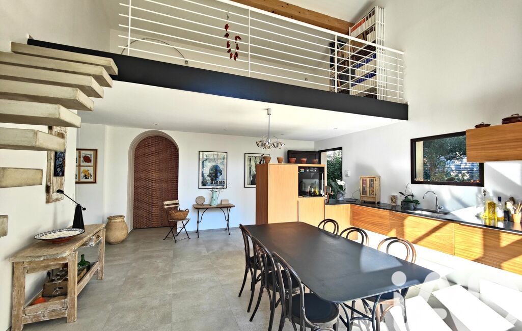 En empruntant l'escalier suspendu, vous accédez à une mezzanine avec vue plongeante sur la cuisine et les extérieurs, offrant un espace bureau, lecture ou chambre d'amis selon vos envies.