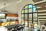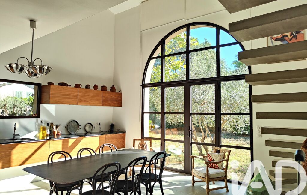 La cuisine moderne avec son vaste espace repas, idéal pour les moments en famille ou entre amis, est dotée d'une vaste OUVERTURE PLEIN SUD en verre et fer forgé, créant une atmosphère unique avec le jardin en toile de fond.