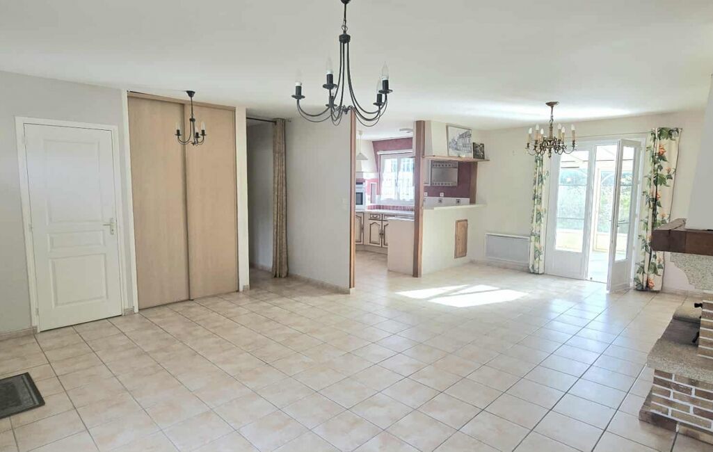 Elle se compose d’une entrée ouvrant sur un double séjour lumineux avec cheminée insert, d’une cuisine ouverte aménagée et équipée, et d’une véranda carrelée donnant sur le jardin.