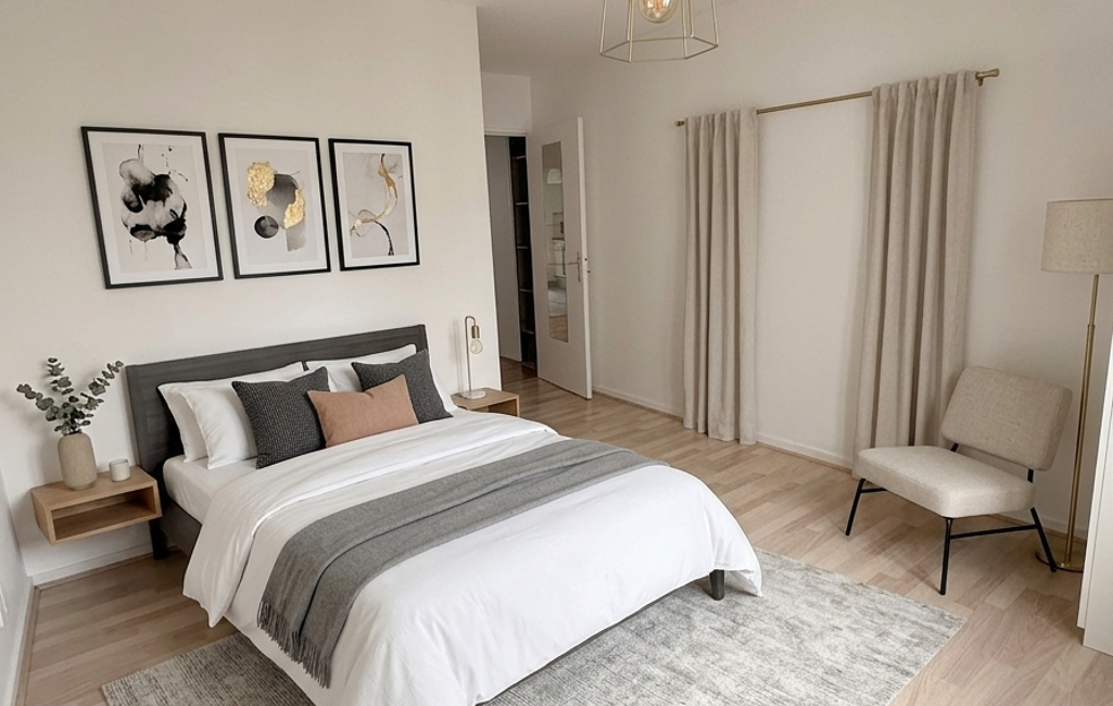 Côté nuit, la chambre de 13,60 m², orientée côté calme, est pensée pour le repos. Elle bénéficie d'un dressing séparé et d'un accès direct