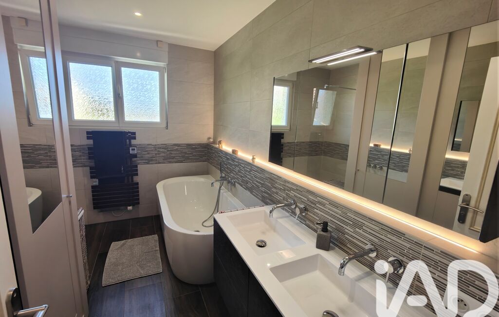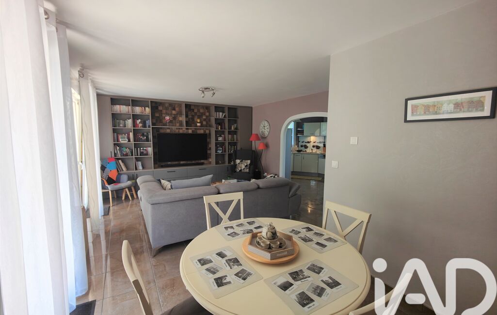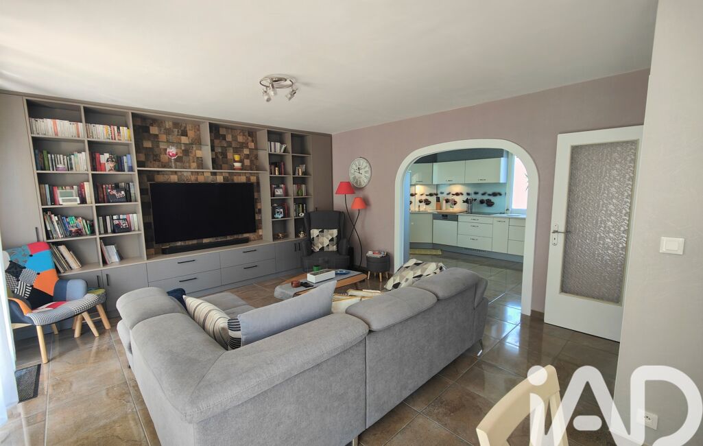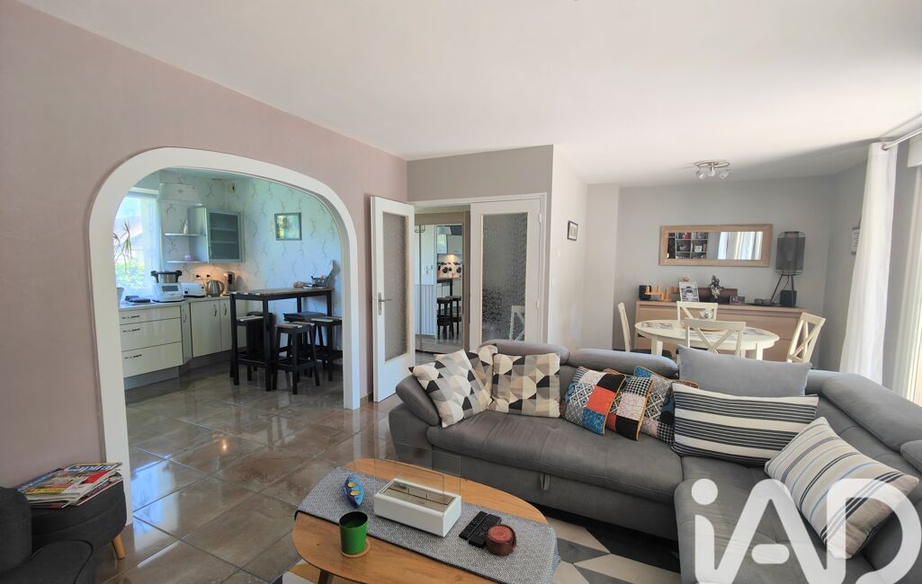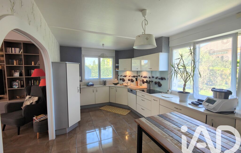 iad France - Laurence CAU vous propose: Jolie maison de plain-pied sur sous-sol complet en parfait état, composée d'une entrée, cuisine équipée ouverte sur séjour, hall, 3 chambres, salle de bains ( douche et baignoire ), double vasque, WC. Au sous-sol : 2 garages, une cave, 2 pièces de stockage (aérées, éclairées, carrelées) et terrain clos. Combles perdus. Chauffage PAC.