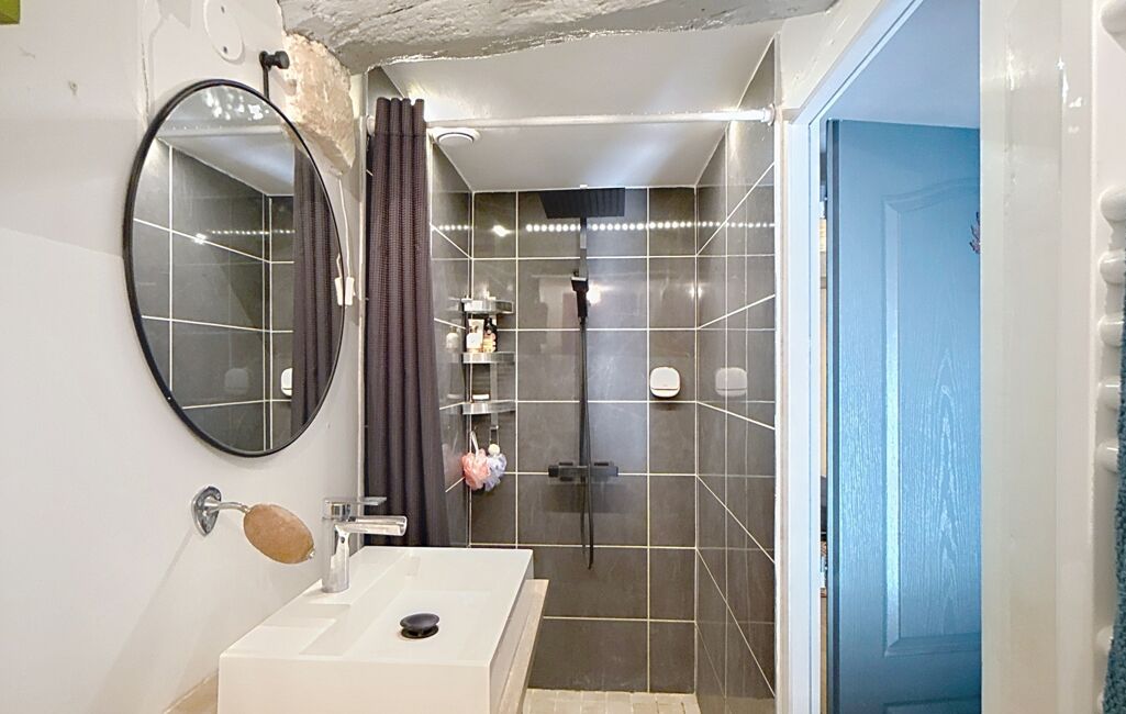 À quelques pas des commerces et des écoles, cette maison de village associe l’authenticité de ses murs en pierre et de ses poutres apparentes à une rénovation pensée pour le quotidien. Dès l’entrée, qui peut aisément faire office de bureau, on ressent la chaleur d’un lieu équilibré. Un demi-niveau plus haut, un premier espace nuit offre une chambre confortable, complétée par une salle d’eau moderne et un WC : pratique pour recevoir ou préserver l’intimité d’un adolescent par exemple.