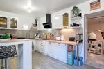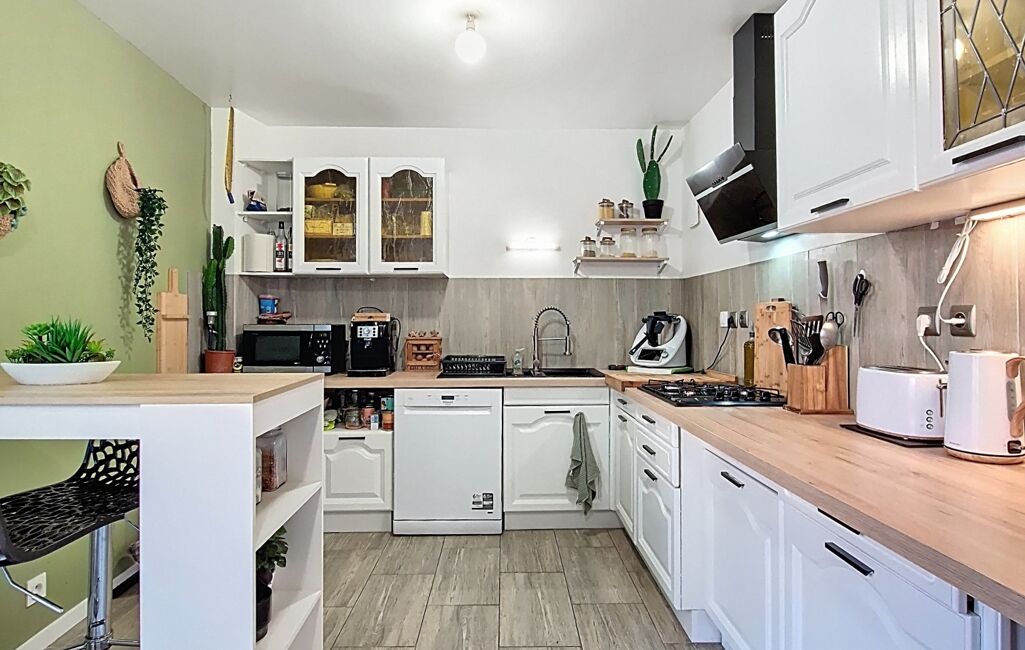 Entrée par la terrasse de 20m² exposée EST dans la cuisine moderne et entièrement équipée.