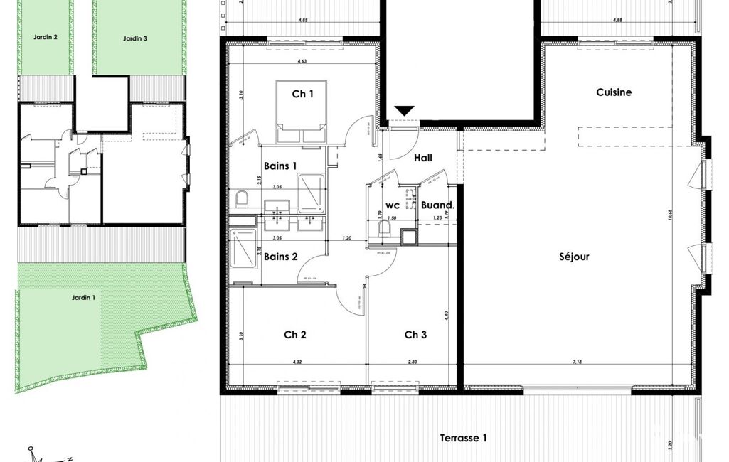 iad France - Arnaud Delhorbe (06 09 11 77 57) vous propose : T4 traversant de 138m2 environ , avec jardins privatifs de 215m2 environ et 70m2 environ de terrasses, situé à pied du village de Biot.