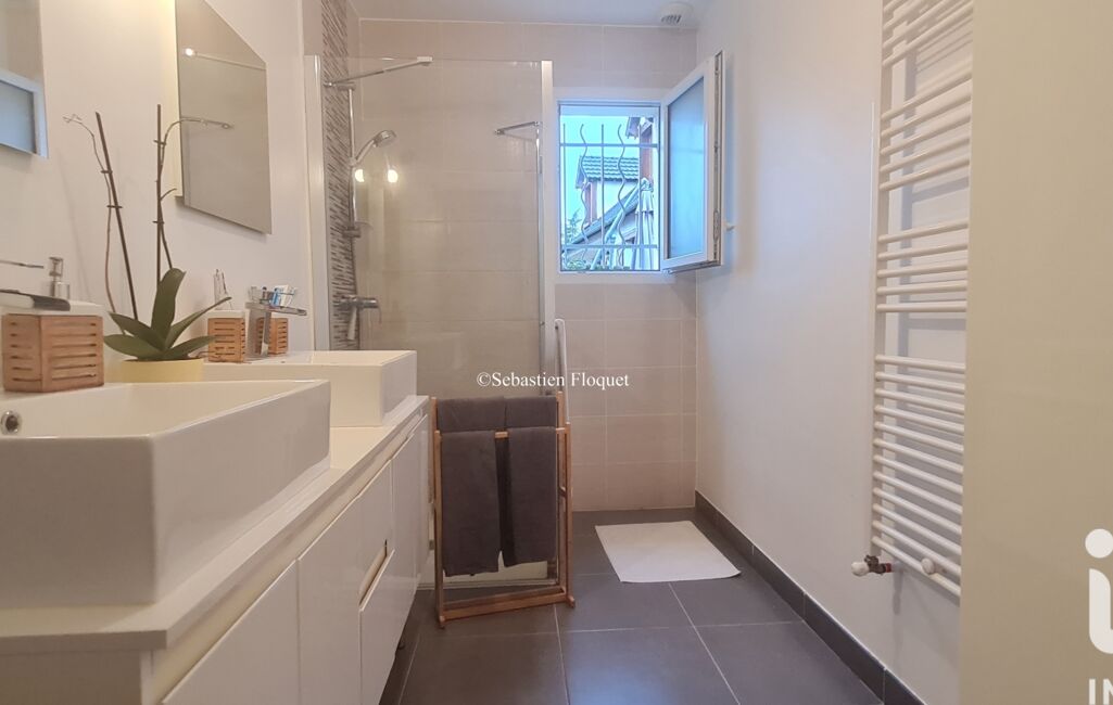 Elle se compose d’une magnifique pièce de vie de 41m² avec cuisine moderne aménagée et équipée, de trois chambres, dont deux avec placards, d’une belle salle d’eau avec double vasque et sèche-serviettes, d’une buanderie, de WC séparés.