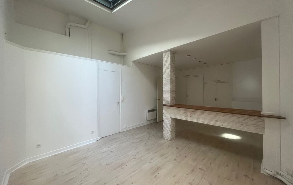 Il se compose d’une entrée avec rangements, d’une pièce de vie bénéficiant d’une belle hauteur sous plafond et d’une verrière apportant un éclairage zénithal en complément de la fenêtre, d’une petite cuisine séparée, ainsi que d’une salle d’eau avec WC.