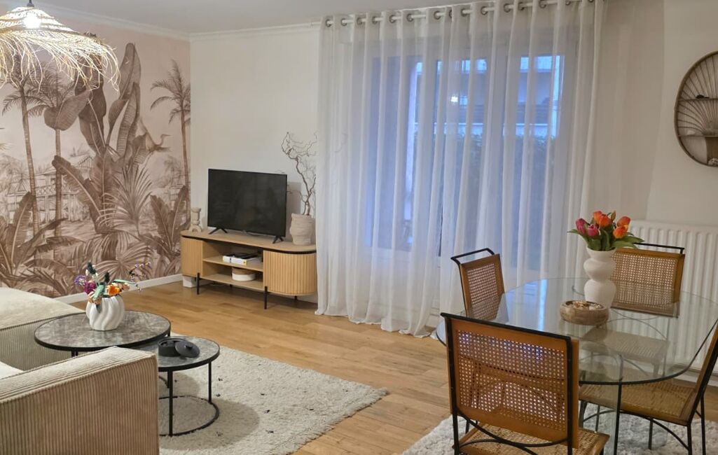 Dès l’entrée, vous découvrez un séjour spacieux avec accès direct à une superbe terrasse d’environ 30 m². Un véritable prolongement du salon, idéal pour les repas en plein air, les moments de détente ou les soirées d’été.
