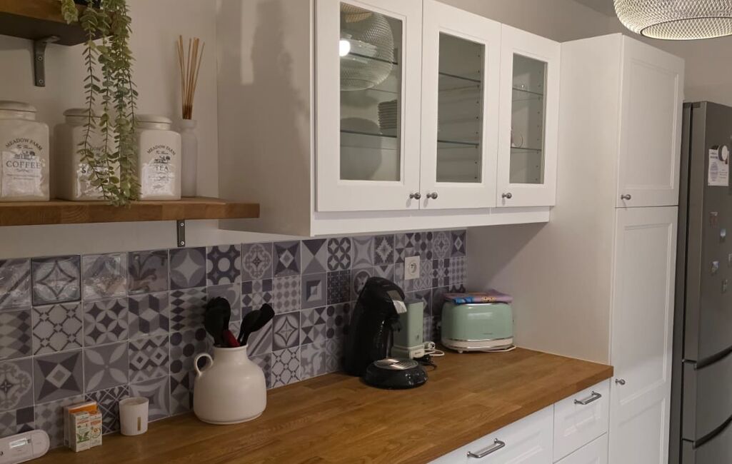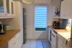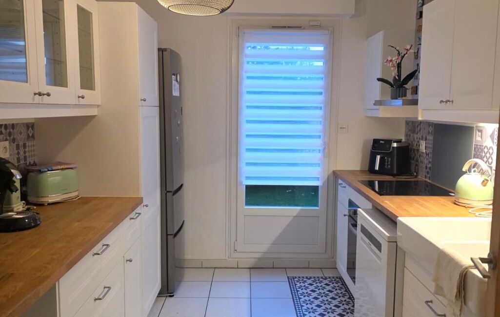 La cuisine séparée, entièrement équipée, offre un espace fonctionnel et convivial, donnant sur une seconde terrasse.