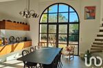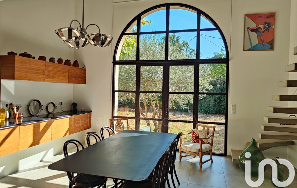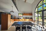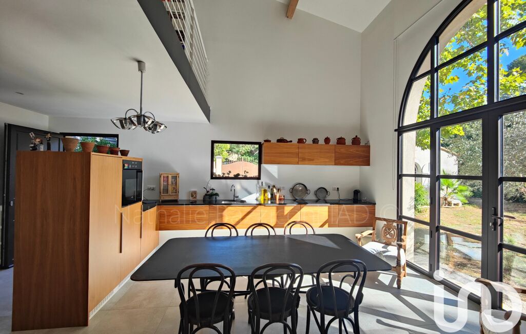 La cuisine moderne avec son vaste espace repas, idéal pour les moments en famille ou entre amis, se pare d’une OUVERTURE PLEIN SUD en verre et fer forgé exceptionnelle, créant une atmosphère dedans dehors avec le jardin en toile de fond.