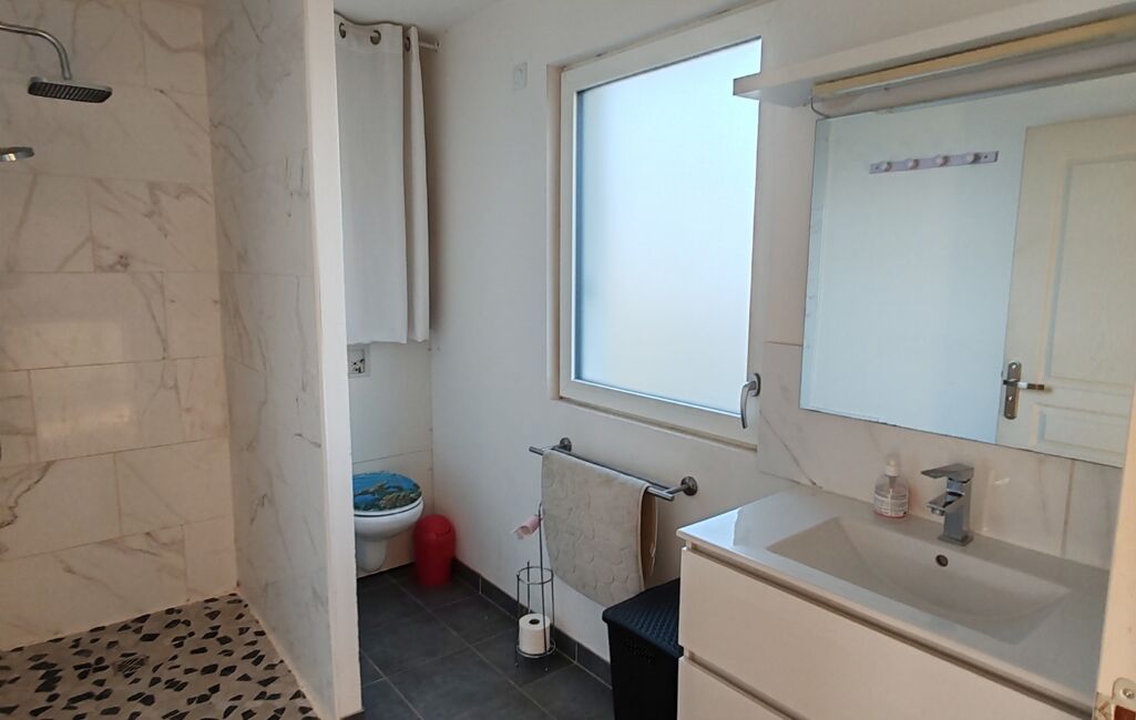 Elle se compose d'une cuisine ouverte sur le séjour, de deux chambres, d'une salle d'eau, ainsi que d'une buanderie cellier pour plus de praticité.
