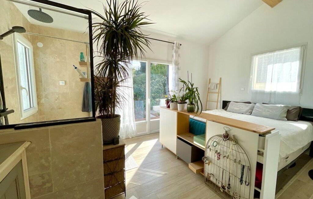 Édifiée sur deux niveaux, la villa propose en plain-pied un vaste séjour lumineux avec cuisine ouverte, prolongé par une véranda et une grande terrasse, une chambre de plain-pied avec salle de douche attenante, ainsi que des toilettes indépendants.