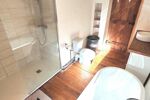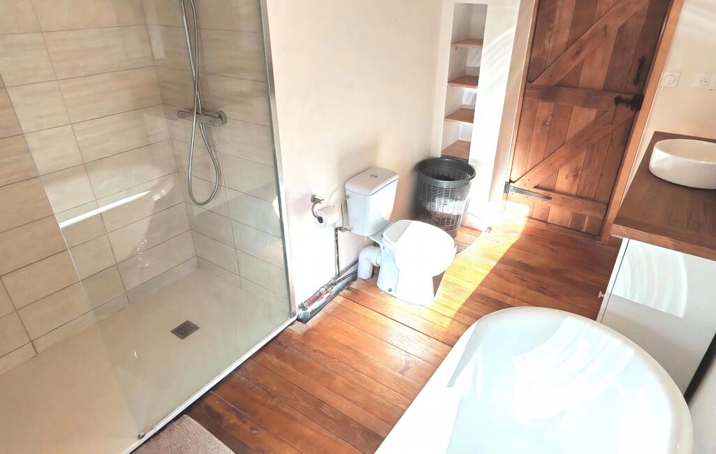 A l'étage : 3 chambres de 16, 20 et 27 m², salle de bain avec toilettes et douche de 8m², salle de jeux/Mezzanine 19 m².
