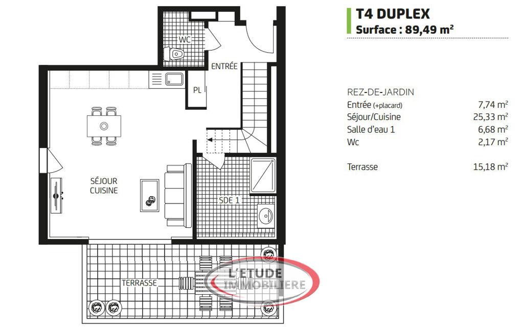 Il se compose au rez de chaussée d'une entrée avec placard, un séjour cuisine avec accès à une agréable terrasse, une salle d'eau et un WC.