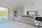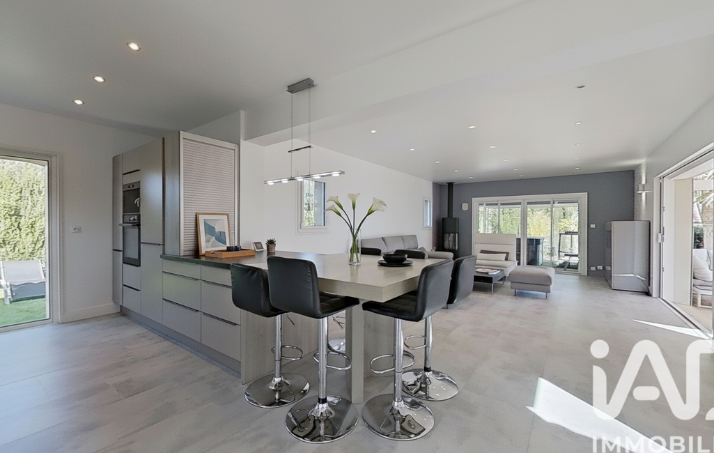 La maison développe 156 m² et s’organise autour d’une belle pièce de vie ouverte sur l’extérieur grâce à de larges baies vitrées à galandage. La cuisine, moderne et bien intégrée, accompagne cet espace convivial tourné vers les extérieurs.