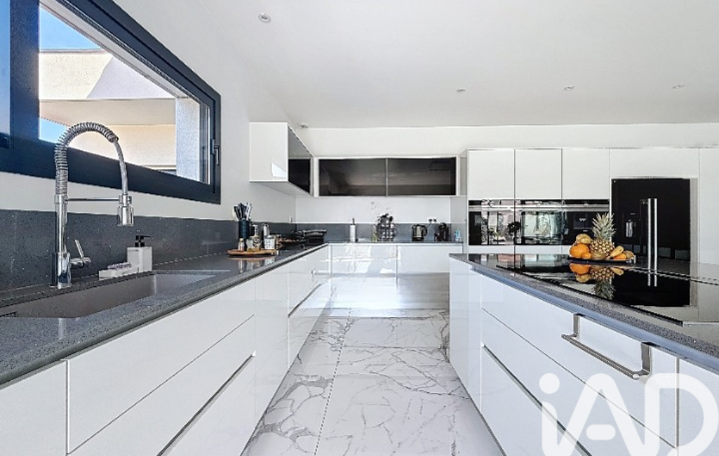 Puis le cOEur de la villa vous fait face : la pièce de vie de près de 100 m² vous enveloppe dans une ambiance chic et chaleureuse. Carrelage XXL, lumières tamisées, cheminée électrique et cuisine américaine suréquipée aux finitions ultra-soignées (réfrigérateur américain, fours encastrés, 4 caves à vin, cave à cigare, cafetière à grains, placards tactiles) composent une scène de vie aussi pratique qu'élégante. Chaque détail a été pensé pour sublimer le quotidien.