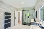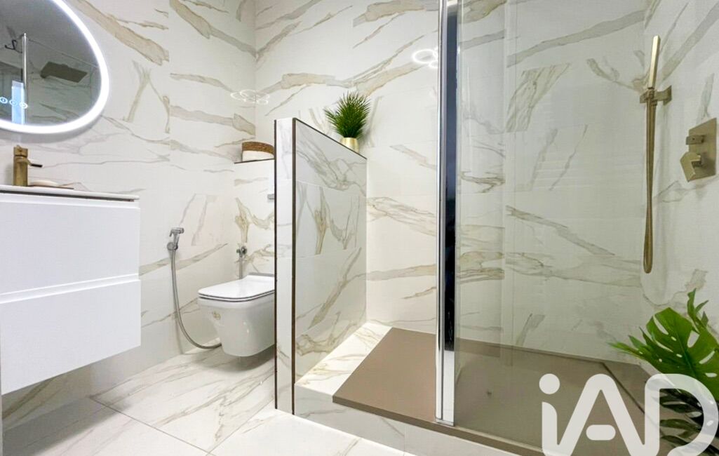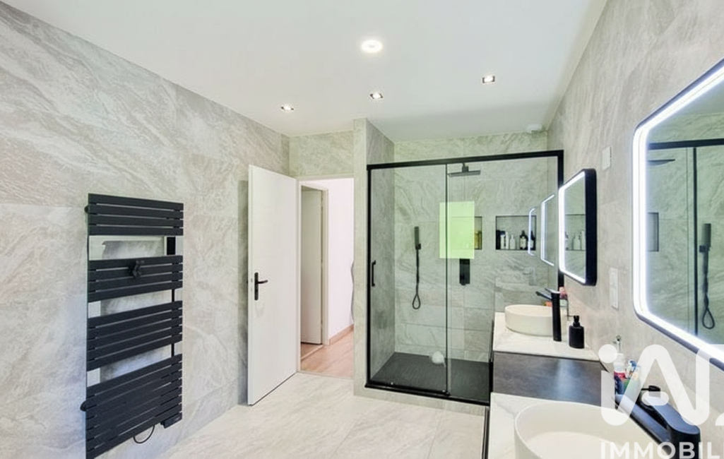La salle de bain luxueuse, aménagée et équipée, agrémentée d'une double vasque, d'une surface de 10 m², est dotée d'un coin baignoire ainsi que d’une douche à l'italienne.