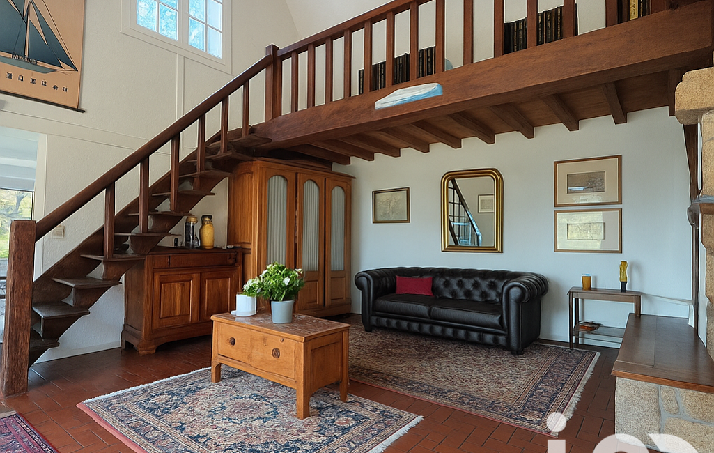 Un grand salon /séjour /salle à manger avec mezzanine et sa cheminée pour les longues soirées d'hiver , sans oublier le bow window offrant une vue à 180 ° sur le magnifique parc paysager.