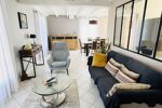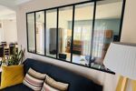 En entrant, vous découvrirez un hall d'entrée accueillant qui dessert un lumineux et spacieux séjour de 34m², ainsi qu'un bureau idéal pour le télétravail ou une chambre supplémentaire, deux chambres, une salle de bain, et une cuisine aménagée, ainsi qu'un cellier et une buanderie pratique.