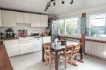 La cuisine indépendante de 17 m² environ, conviviale et entièrement équipée, dispose de baies vitrées et de fenêtres rénovées en 2022, offrant un accès direct au jardin. Une pièce au rez-de-chaussée peut être utilisée comme bureau ou chambre de plain-pied, et un WC indépendant complète ce niveau.