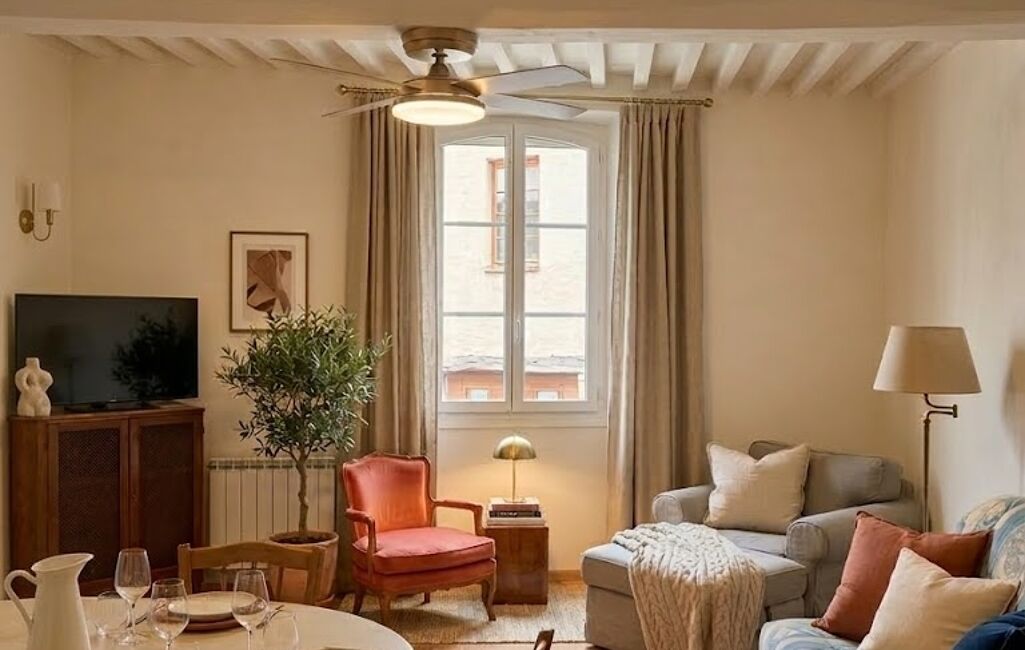 Le premier étage accueille un agréable salon avec une cuisine ouverte entièrement refaite, créant un espace de vie convivial.