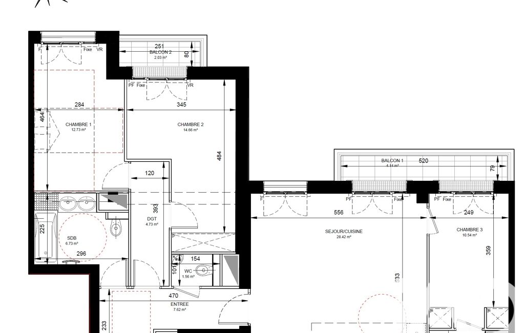 L'appartement s'organise avec une entrée, 2 chambres (12, 10 m²) dont 1 avec balcon, toilette séparé, salle de bain avec toilette, couloir qui mène à la pièce de vie de 28 m² avec un balcon : cuisine équipée, aménagée et ouverte sur le salon, puis une chambre parentale de 14 m² avec un balcon et sa salle d'eau. Les 3 balcons de 6 m² offrent des espaces extérieurs agréables, au calme sur le jardin de la copropriété.