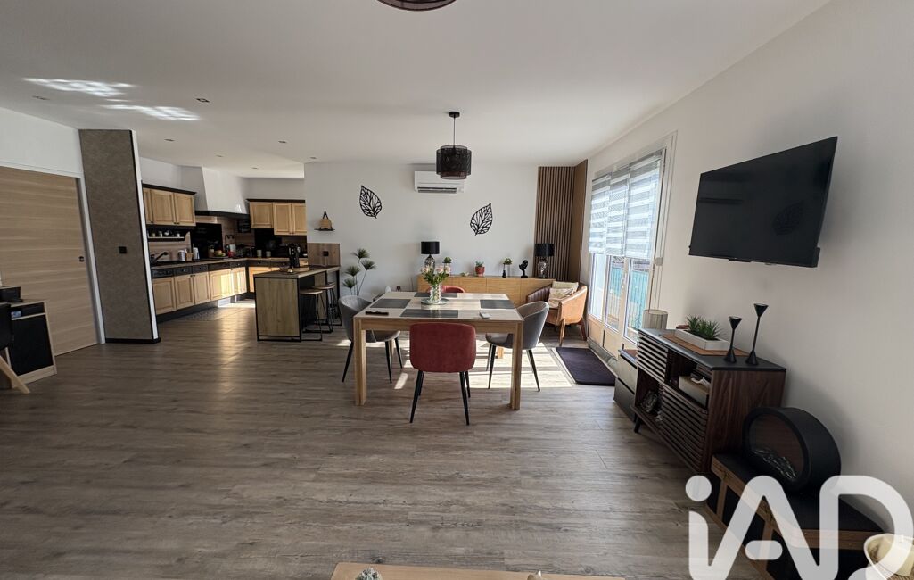 La pièce de vie, largement ouverte et exposée plein sud, accueille un salon, une cuisine et une salle à manger dans une atmosphère chaleureuse et conviviale.