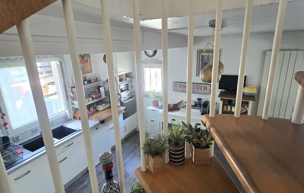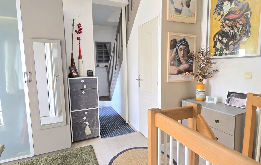 Au 1er étage, un palier dessert une belle chambre, des WC, une SDB et une terrasse ensoleillée, qui offre un second accès à la maison.