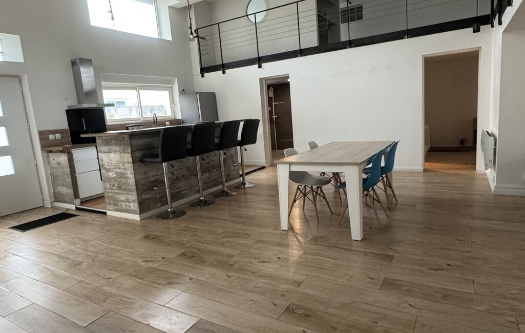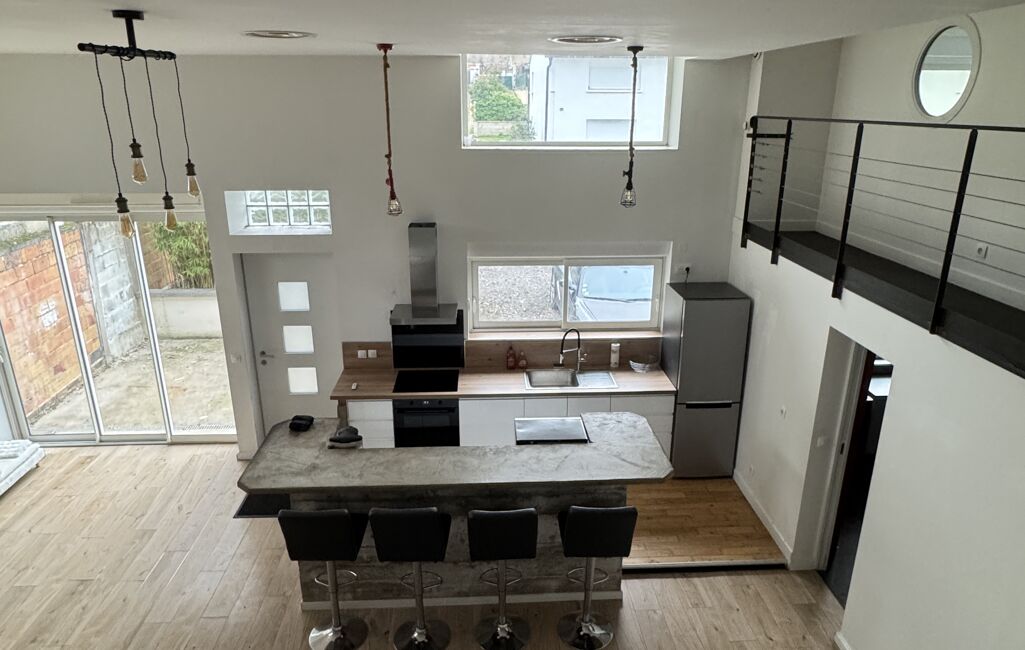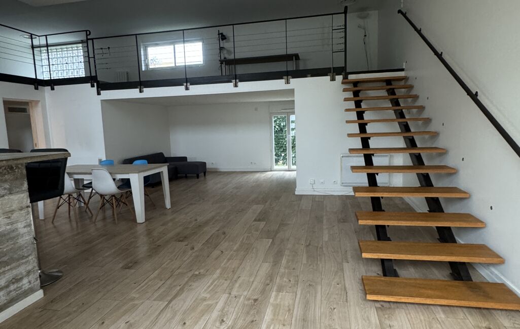 IMMOTAM loue un loft meublé de 100m2 ,hauteur sous plafond 4m, lumineux , deux chambres (une grande et une petite ) , salon/séjour de 30M2 donnant sur une jardinet de 35m2, cuisine équipée ouverte, terrasse , une place de parking, une grande salle de bain , une mezzanine de 17m2 pouvant servir de bureau ou espace de détente
